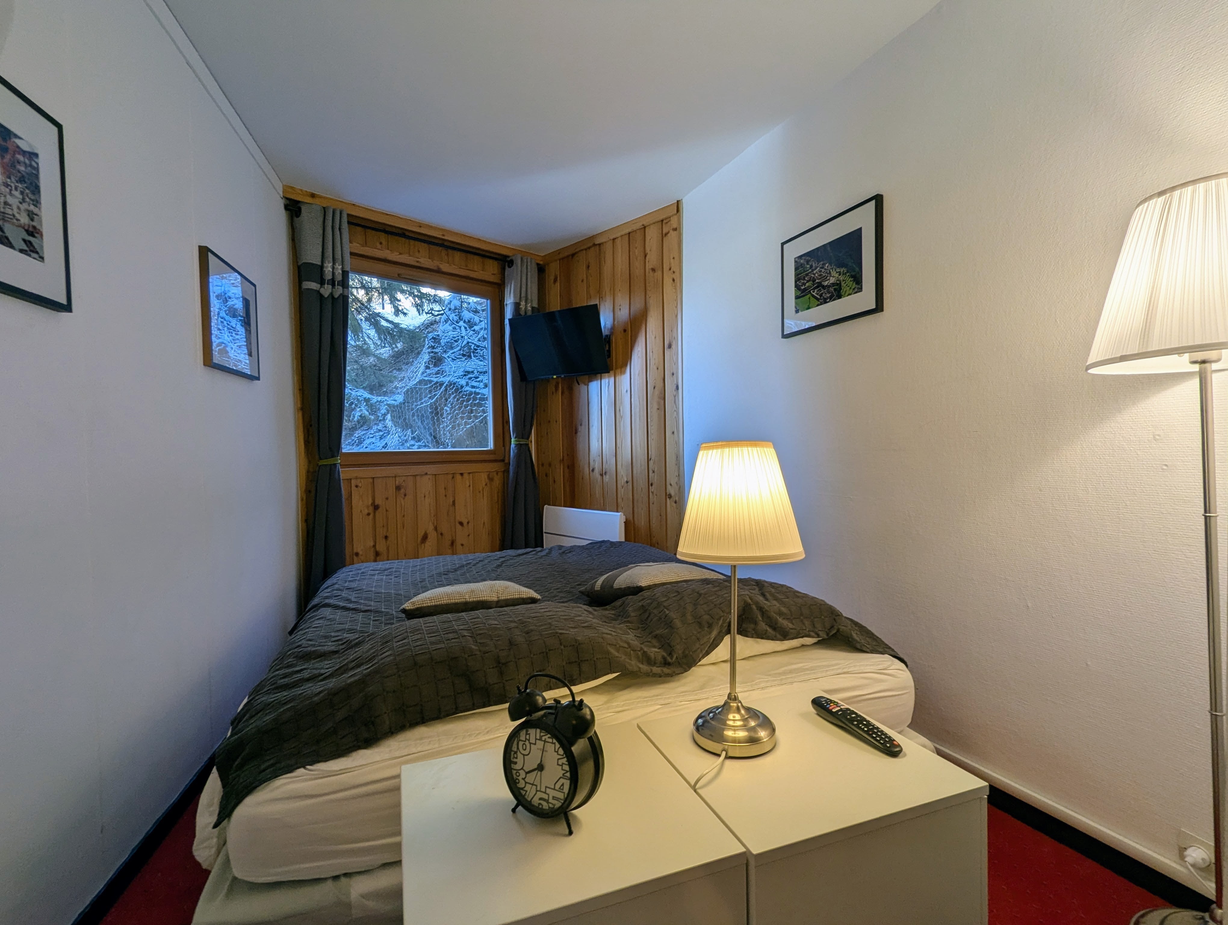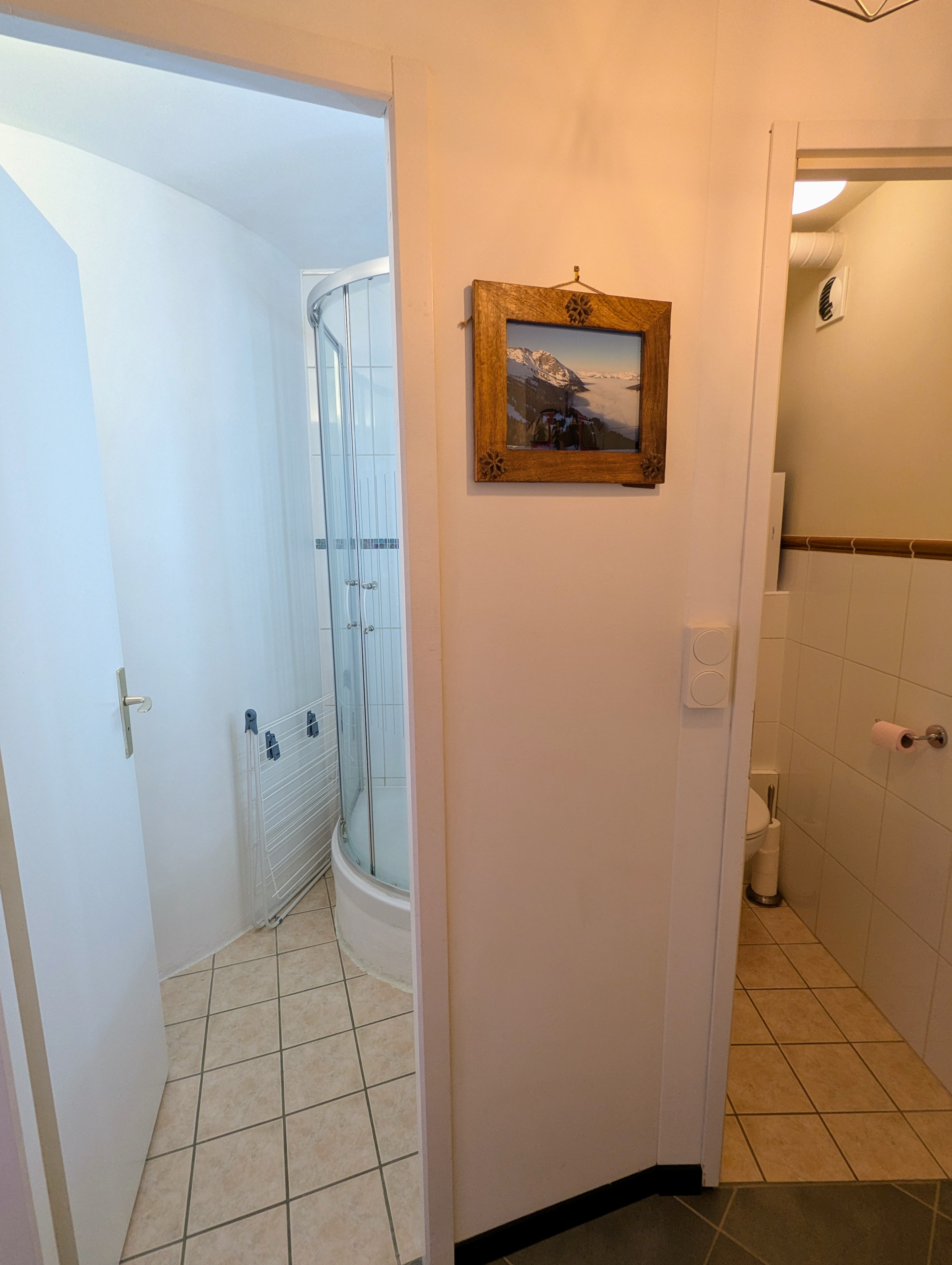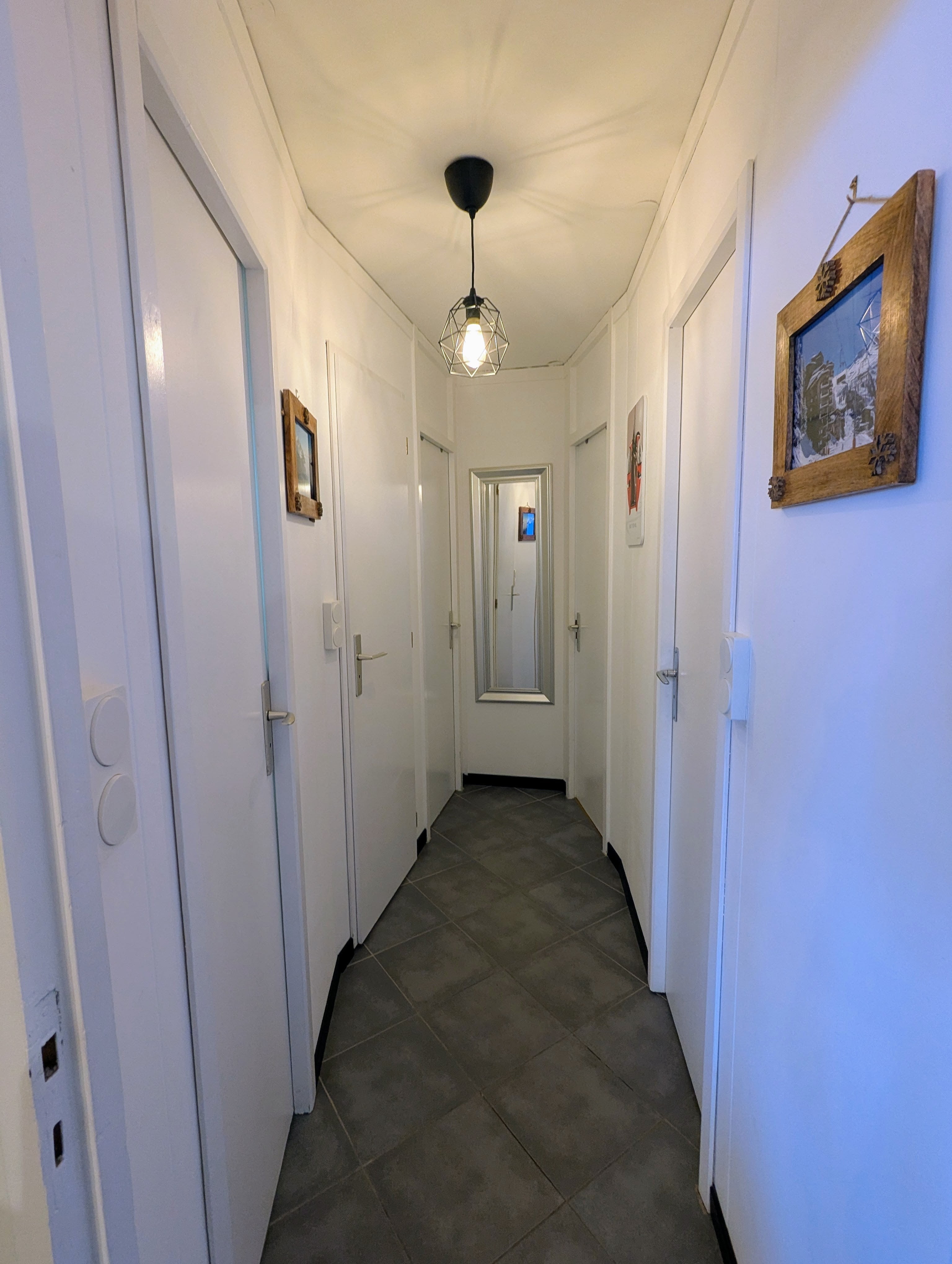 - L’espace nuit, indépendant du séjour (accès par couloir fermé) se compose d’une chambre double, d’une chambre avec lits superposés, toutes deux dotées de grands placards. Cet espace comprend également une salle d’eau avec douche, une salle de bain avec baignoire et machine à laver, ainsi qu’un WC indépendant.