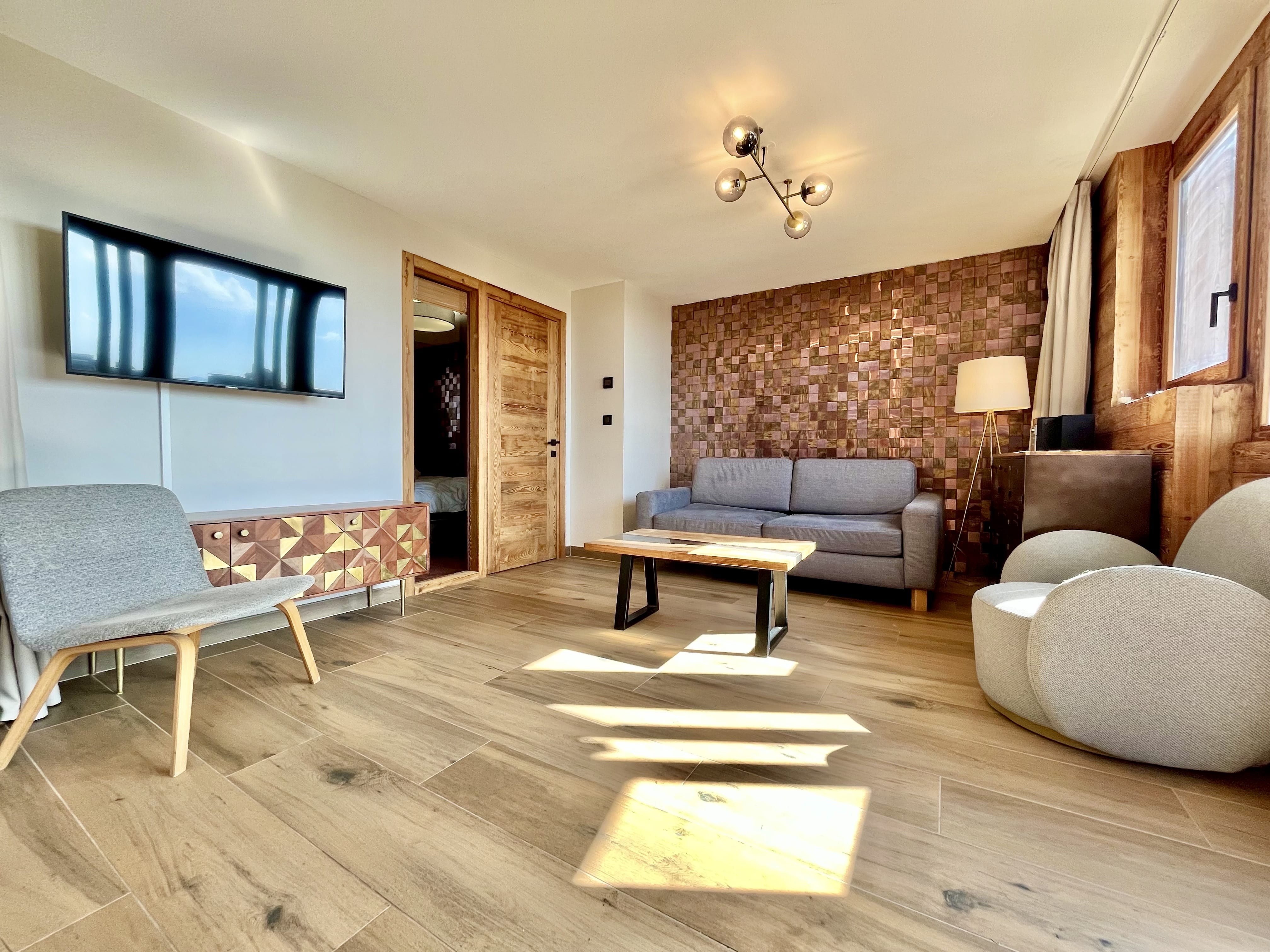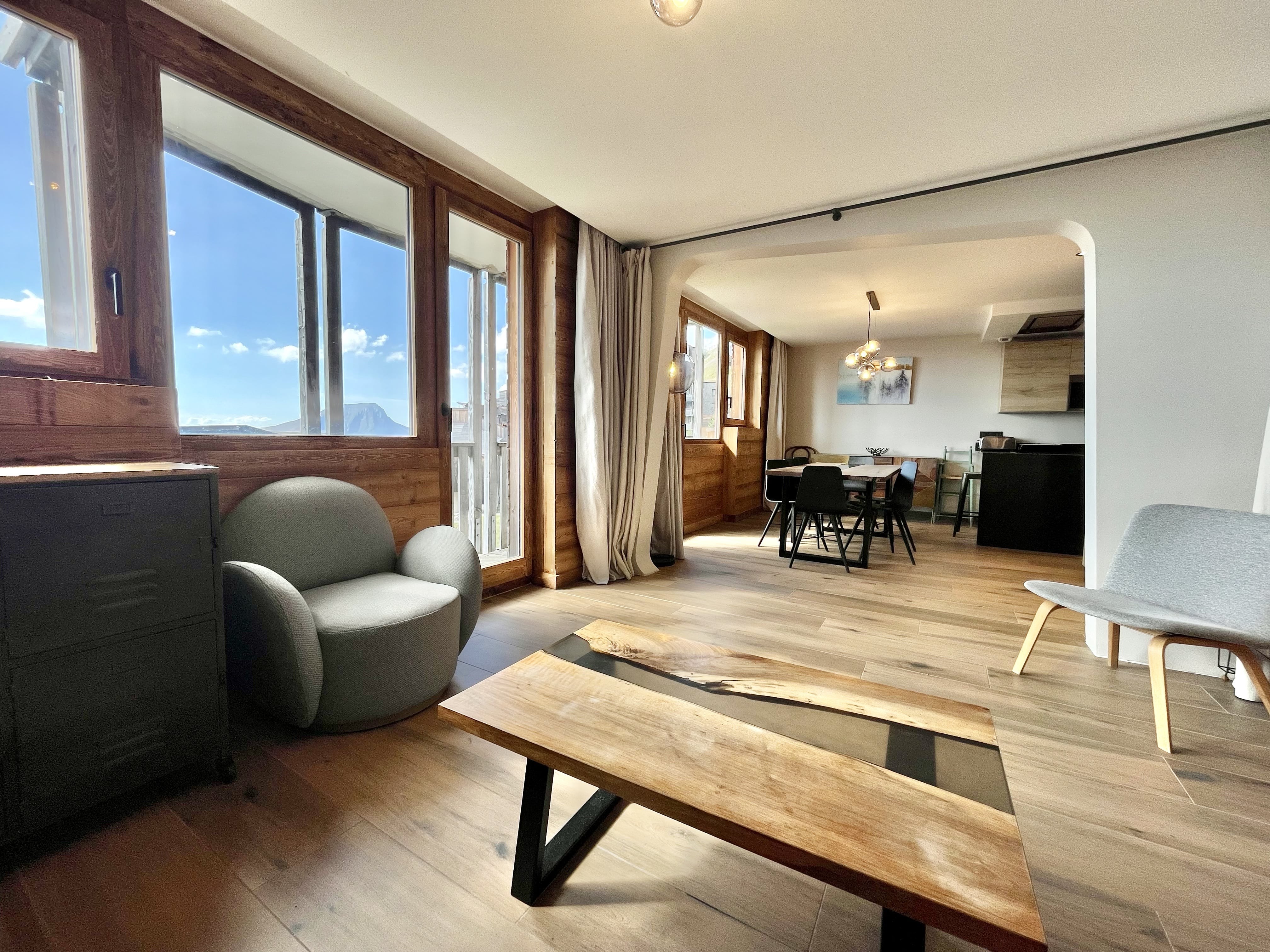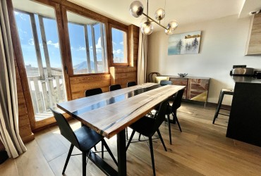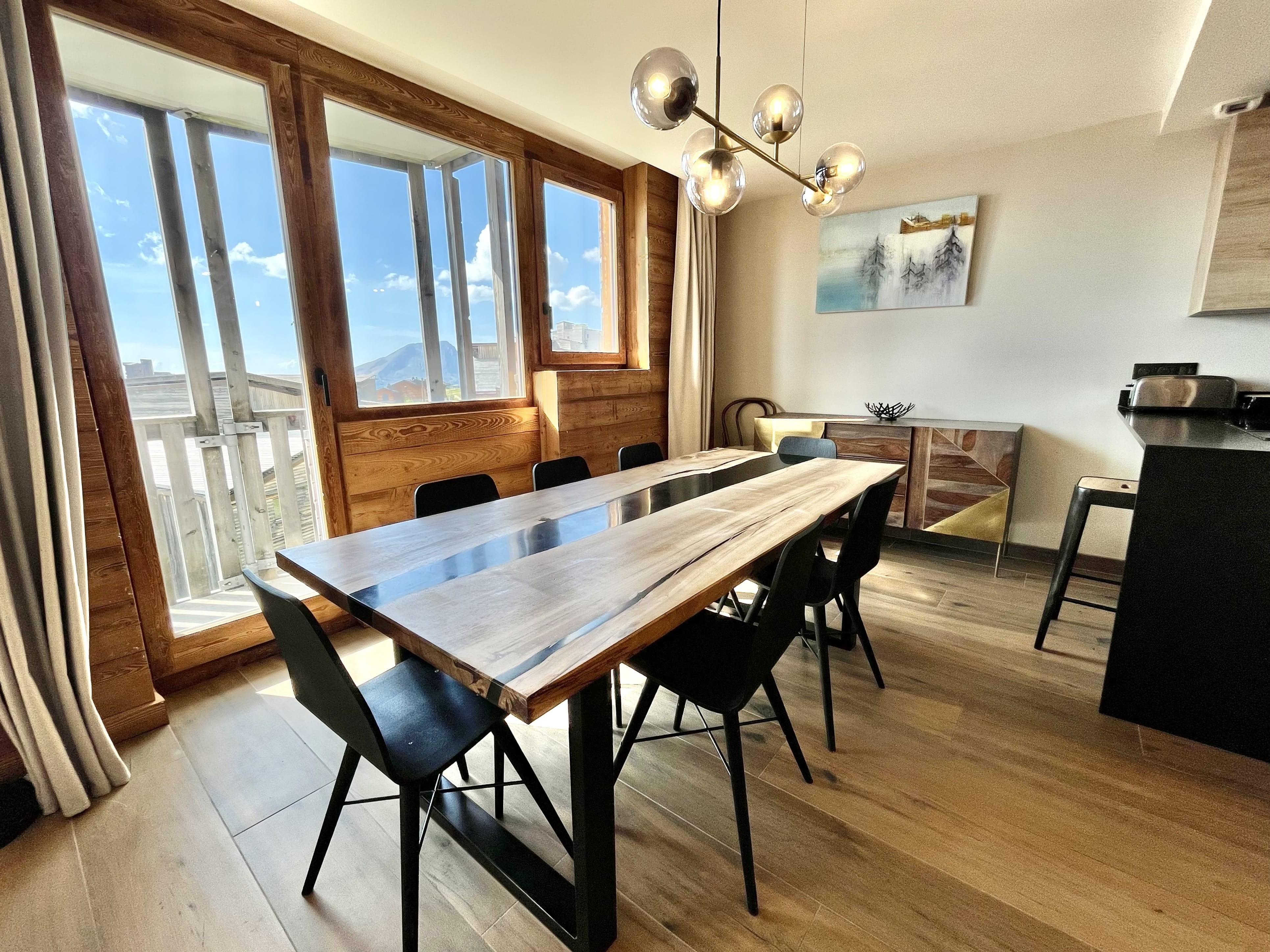 - Grand séjour, très lumineux, aménagé avec une belle cuisine ouverte très bien équipé, un espace repas confortable pour 6/8 personnes ainsi qu’un salon cosy et charmant (offrant 2 couchages supplémentaires sur le canapé convertible), accès un long balcon offrant une exposition Ouest et une belle vue vers les montagnes et le Plateau d’Avoriaz