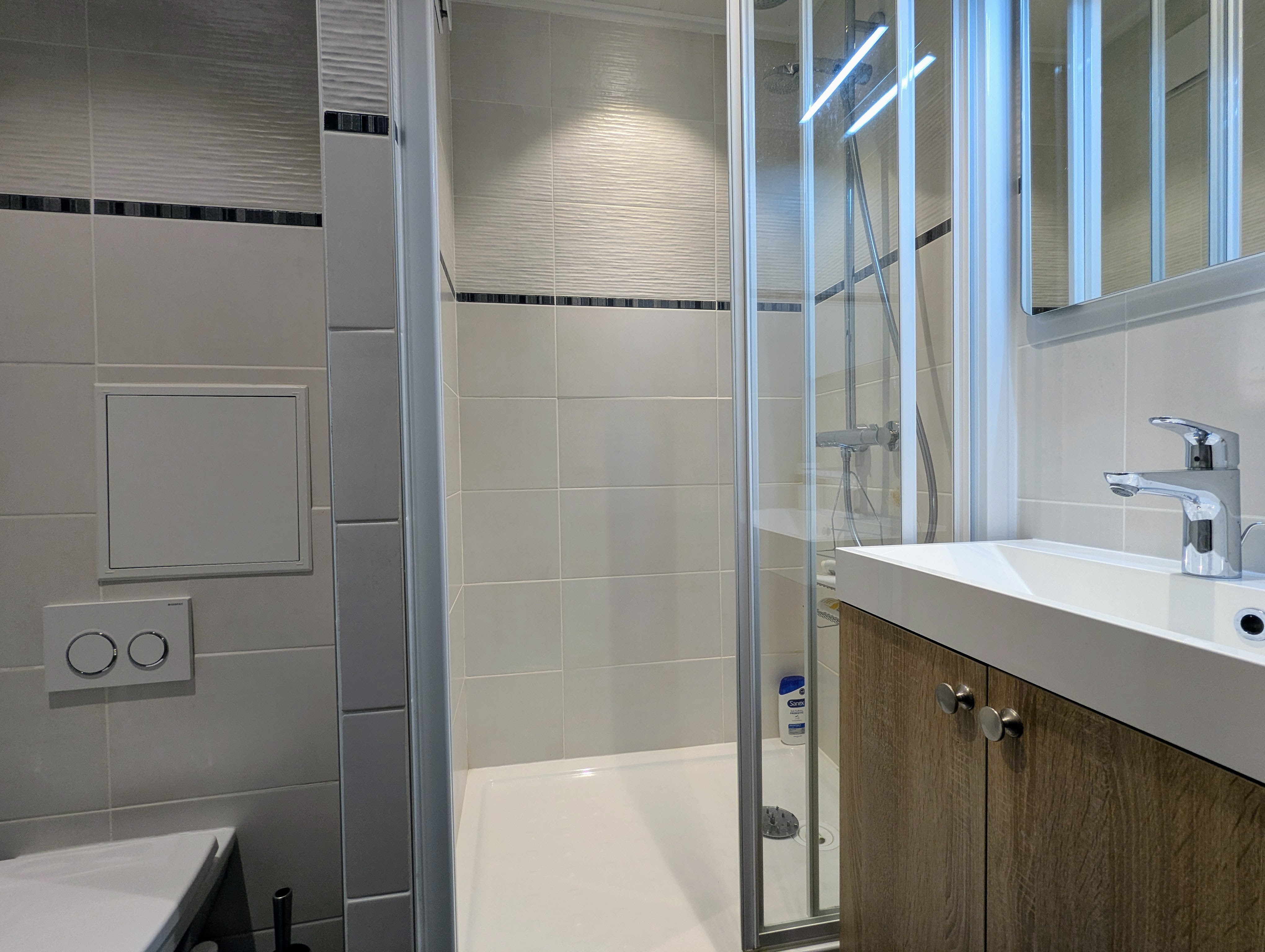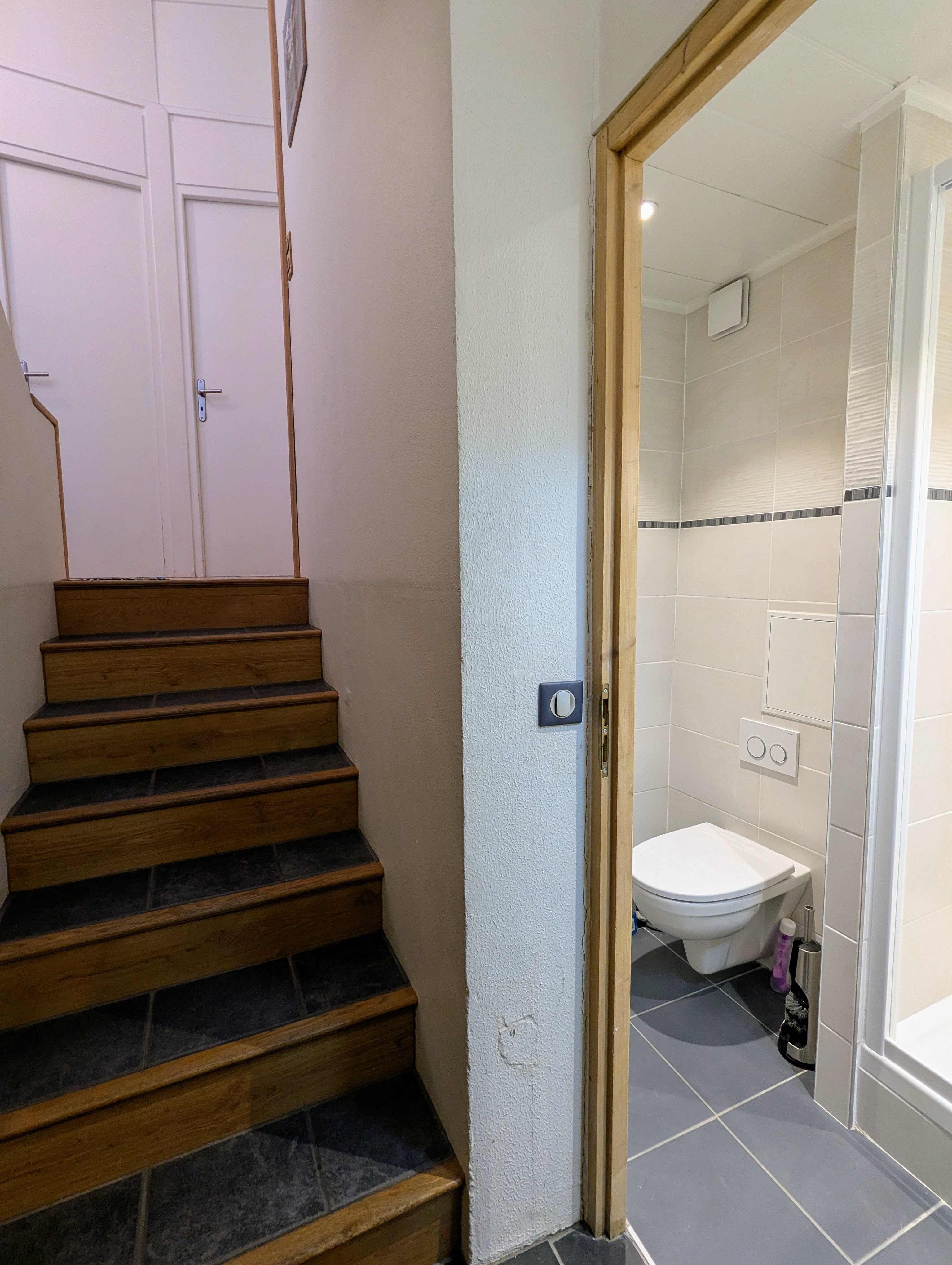 In the entrance, a shower room with WC and towel dryer. After 4-5 steps, on the 1st landing is a double bedroom, a bedroom with 2 bunk beds and a bathroom with bath / towel dryer and washing machine.