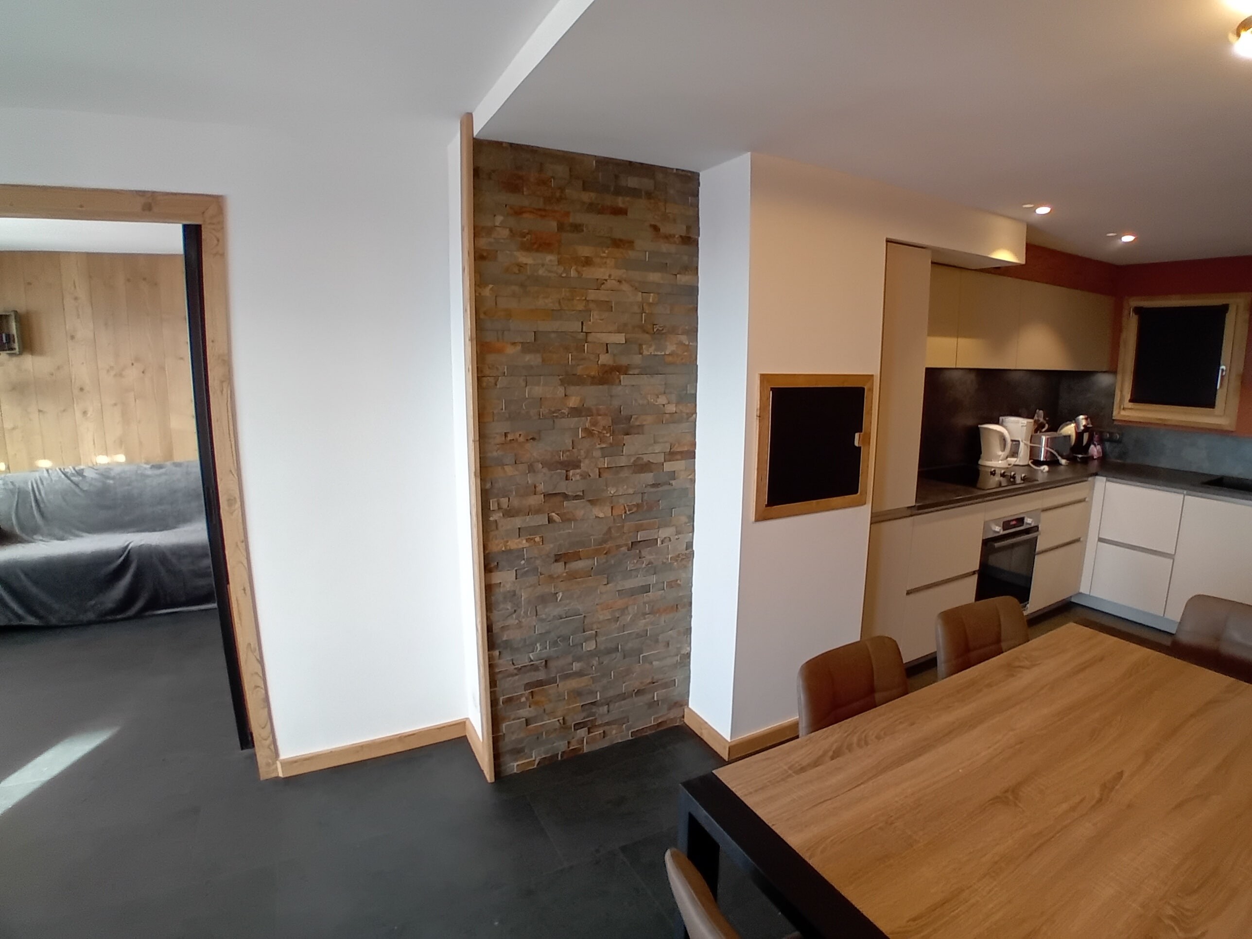 Un séjour avec une table permettant de manger à 6 très confortablement, une cuisine ouverte entièrement équipée (plaques vitrocéramique 4 feux, frigo, lave-vaiselle, four, micro-onde, machine à café Dolce Gusto, grille pain, appareil à raclette/fondue). Un espace salon avec TV et canapé convertible.